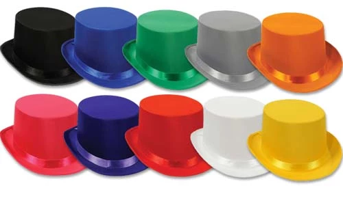 Top Hat in a satin sleek finish. Many bright color choices. One size fits most.