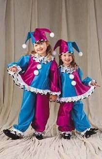 Costume includes blouse with pom-pom and ruffle trim, hat with pom-pom trim and pants.