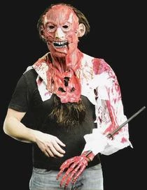 Full over-the-head mask with partial bloody shirt and skinned left arm.