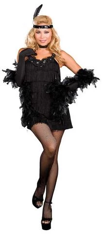Costume includes stretch knit dress with tiered fringe and beaded neckline trim, headband with feather, choker and boa.