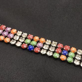 This three row, multi-color rhinestone trim has a beautiful varying pattern. The colors alternate in a varying pattern. Colors in the trim are orange, lavender, blue, light green, and red separated with two row of rhinestones.