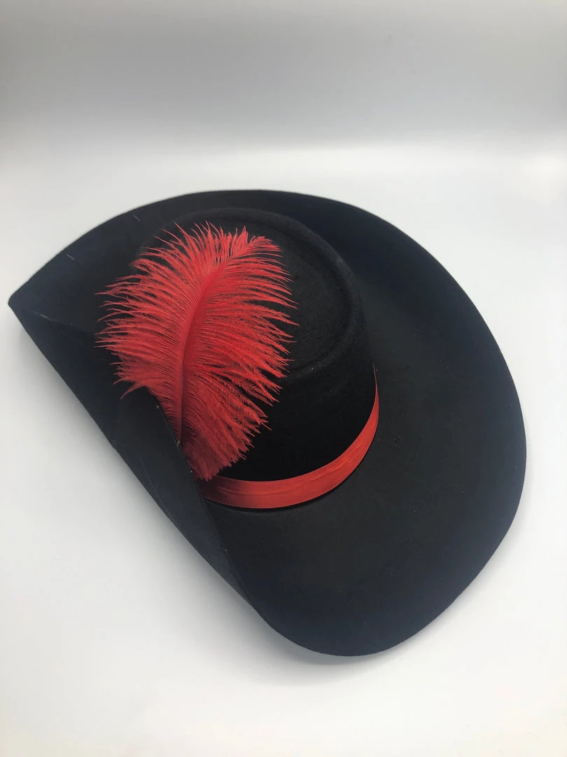 Cavalier or Musketeer Hat is made of black permalux. Includes a white plume.11″ folded brim to open side and 16″ from front to back.