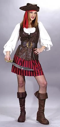 Deluxe costume includes blouse, skirt, boot tops, belt, bandana and hat.