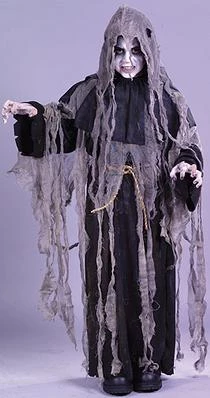 Costume includes hooded robe, gauze tatters, belt and black neck tatters.