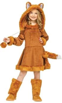 Costume includes velvet dress with plush trim, tail, boot covers and hood with ears.