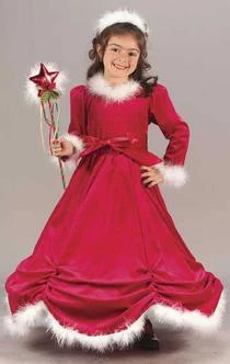 Costume includes long velvet dress with hoop and marabou trim, sash, wand and headpiece.