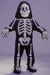 Includes Jumpsuit w/3-D Latex Bones, Mask, 3-D Gloves, 3-D Shoe Tops. Glows Under Black Lights