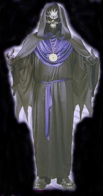 Costume includes robe, chest drape, hooded cape, gloves, belt, medallion and mask.