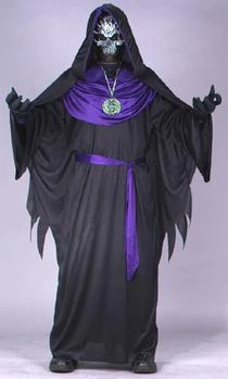 Costume includes robe, hood with attached cape, drape, gloves, belt, mask and medallion.
