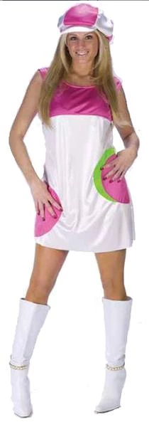 Costume includes 60s style pop art pattern dress with matching poor boy hat. (Boots not included)