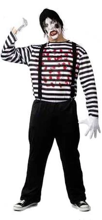 Costume includes blood stained mime shirt, pants, suspenders, gloves and hat with attached hair.