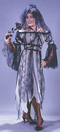 Costume includes dress, tatters, sleevelets, tie and veil.