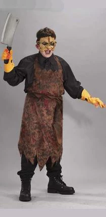 Costume includes apron, gloves, belt, cleaver and mask.