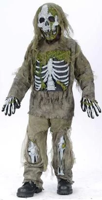Costume includes mask with gauze, shirt with gauze and chestpiece, pants with gauze and bones, gloves.
