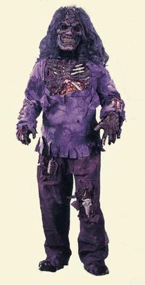 Deluxe costume includes shirt and pants with sewn in latex body parts, zombie gloves and mask with wig.