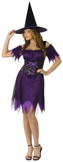 Costume includes purple, low cut, scalloped dress with black sheer layers, lace-up bodice look front and matching hat.
