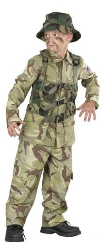 Costume includes authentic looking camoflage shhirt and pants with cargo pockets, vest and boonie hat.