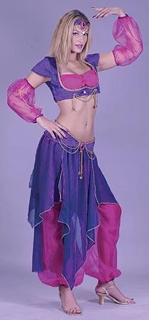 Costume includes top, bra, sleeves, skirt, pants, belt and headpiece.