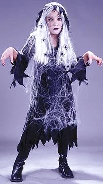 Costume includes dress, jacket with hood, wig, spiderweb and spiders.