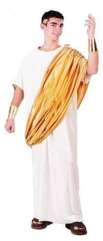 Costume includes robe, drape, wrist cuffs and leaf wreath headpiece.