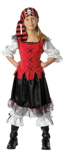 Costume includes lace-up vest with attached sleeves, skirt and pirate head scarf. (Bloomers and boot tops not included)