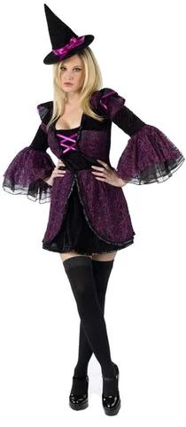 Costume includes sparkling purple lace dress with bell sleeves and matching mini witch hat on headband. (Stockings not included)