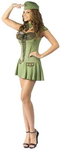 Costume includes drop waist dress with lace-up bust and name tag, overseas cap, collar with tie.