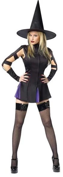 Costume includes zipper front mini dress with purple kick pleats, cut out sleeves and witch hat. (Stockings not included)