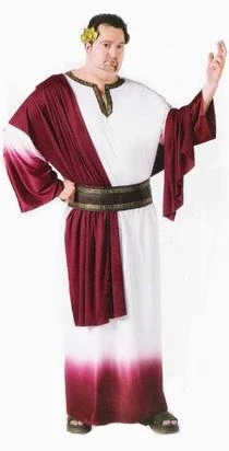 Costume includes ombre edge robe, burgundy shoulder drape, belt and head wreath.