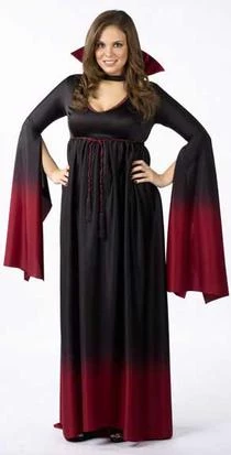 Costume includes fading black-to-burgundy gown with collar, belt and choker.