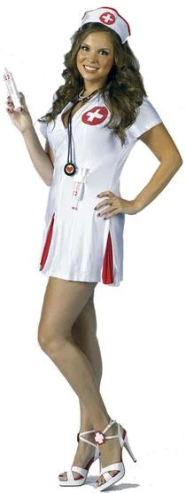 Costume includes dress, nurse cap, stethoscope and 2 shot syringes for alcohol.