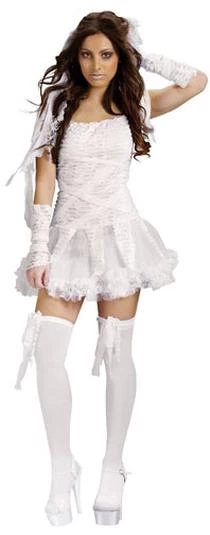 Costume includes tattered tutu dress, sleevelets and thigh highs.