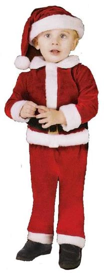 Costume includes jacket, pants, belt and Santa hat.