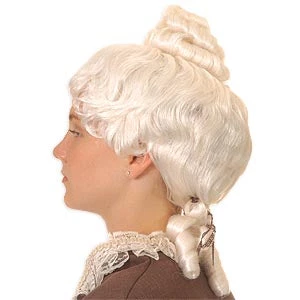 Colonial Lady Wig is a classical colonial updo with ringlet tail, 3-tiered ringlet bun and tie ribbon. Adjustable sizing.