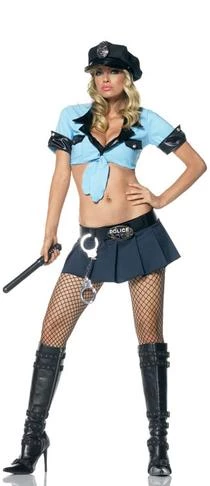 Costume includes tie top, pleated skirt, hat, belt with buckle, baton and handcuffs. (Stockings and boots not included)