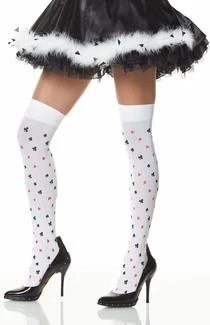 Opaque nylon thigh high stockings with card symbols (Hearts, Diamonds, Spades, Clubs). One size fits most.