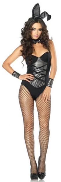 Costume includes tuxedo teddy, bow tie, wrist cuffs, tail and headband with ears. (Stockings not included)