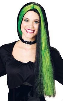 24 inch black witch wigh with green streaks.