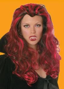 Unisex 26 inch long red and black wig with widows peak.