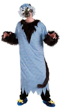 Costume includes headpiece, hairy nightie, slippers and latex mask headpiece.
