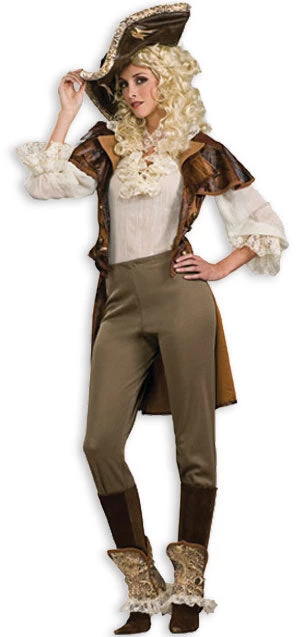 Airship Pirate Girl costume includes jacket, pants, blouse, boot spats, hat & belt. One size fits up to a dress size 12.