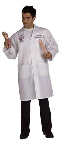 Costume includes lab coat and large finger. Patches say Dr. Ben Dover Proctologist and General Malpractice Hospital.