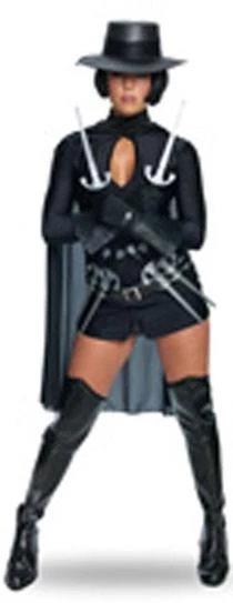 Costume includes dress, cape, boot tops, gloves, belt with six daggers and hat