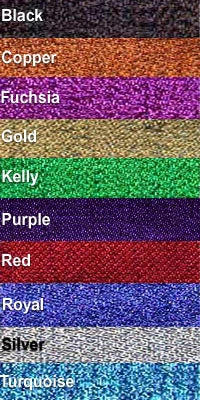 | Color | Black, Copper, Fuchsia, Gold, Kelly, Lime, Purple, Red, Royal, Silver, Turquoise |
