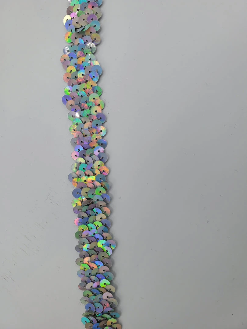 3/4″ Flat Laser Sequin Trim (Stretch) catches light nicely with its holographic sequins. Sold by the yard.