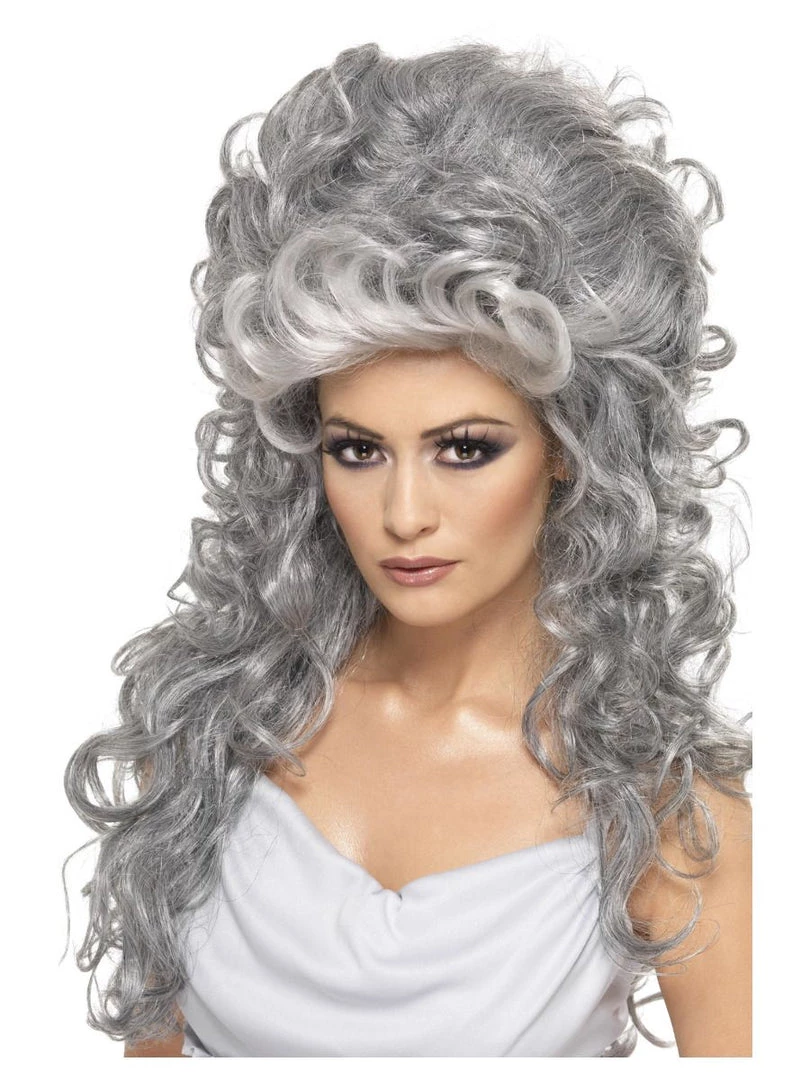 Witch Beehive Wig, Grey, Long & Curly with Beehive Top