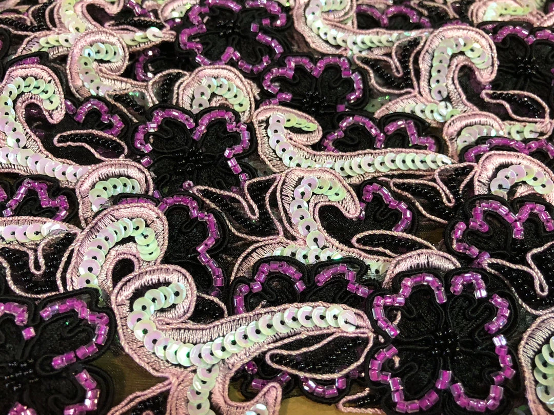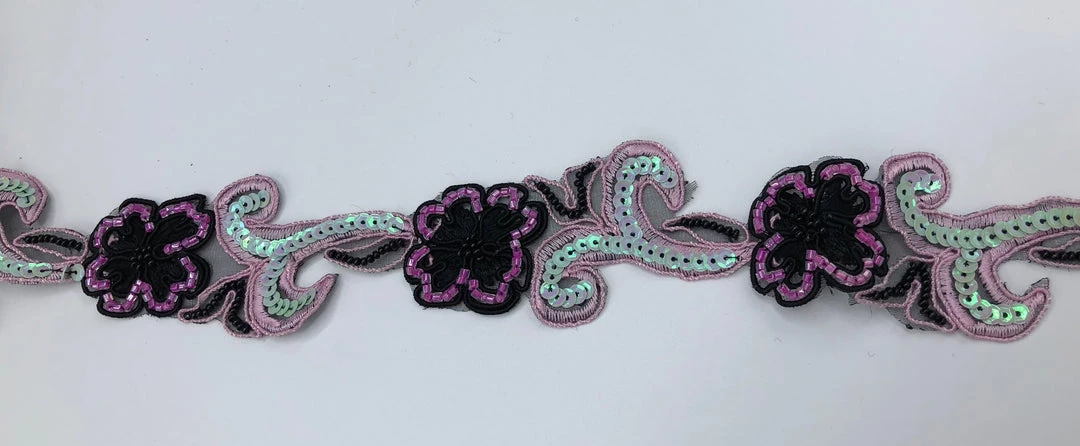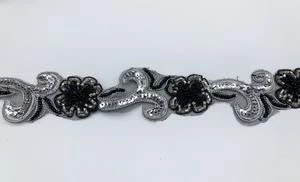 Flower and swirl trim with beads and sequins. Measures 1 1/2″.