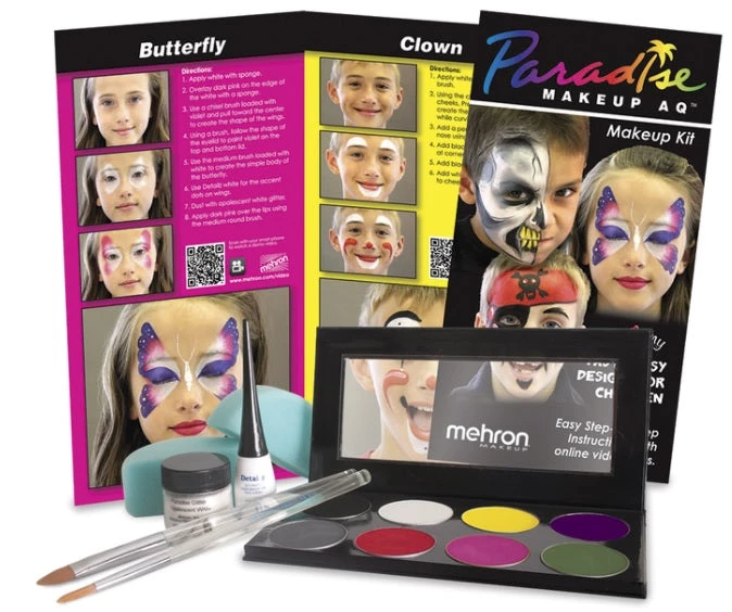 Developed together with the face painting makeup artiste and co-creator of Paradise Makeup AQ™, Jinny Houle, Mehron expands the Paradise Makeup AQ™ by creating a fun face painting makeup kit with children’s designs. The all-inclusive kit includes makeup, tools and step-by-step instructions with online video links on how to create 6 fast & easy designs for children. Crafted for novice face painting artists and anyone interested in face painting for children’s parties.