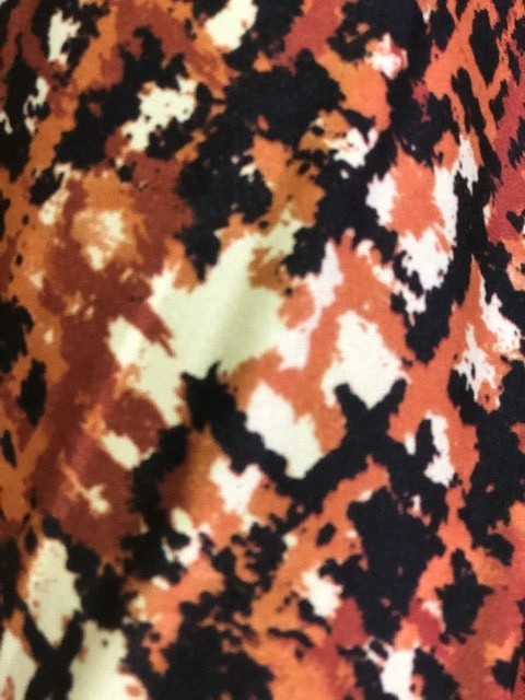 Copper, Black and White tones mixed throughout this Iso-geometric Snakeskin like pattern. 4 way stretch spandex/poly knit. Great swimsuit material! 60″ Bolt