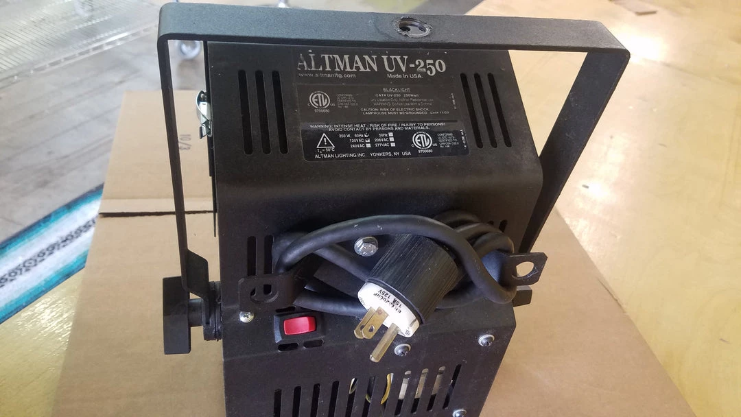 The Altman 250 watt UV-250 is a compact, high output blacklight floodlight. It is designed to provide a wash of high intensity illumination of fluorescent materials at distances of up to 40′. The luminaire does not require any fans for cooling, resulting in extremely quiet operation. A special lens filters out harmful UV-B and UV-C wavelengths and almost all visible light, and is provided with an integral wire mesh safety screen.